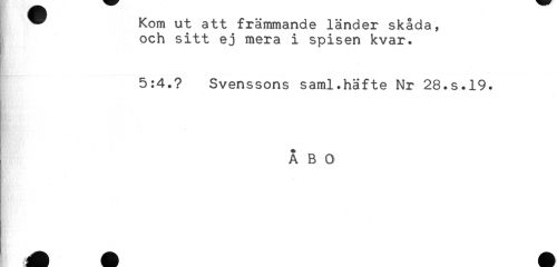 //// ^ Kom ut att främmande länder skåda, //// och sitt ej mera i spisen kvar. //// E //// 5:4.? Svenssons saml.häfte Nr 28.S.19. //// ÅBO ////