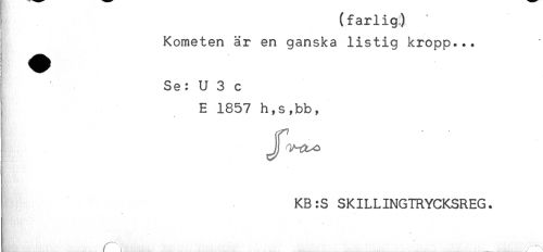 //// (farlig) //// Kometen är en ganska listig kropp... //// Se: U 3 c //// E 1857 h,s,bb, //// KB:S SKILLINGTRYCKSREG. ////