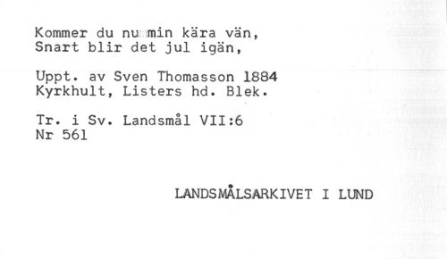 //// Kommer du nu min kära vän, //// Snart blir det jul igän, //// Uppt. av Sven Thomasson 1S84 //// Kyrkhult, Listers hd. Blek. //// Tr. i Sv. Landsmål VII:6 //// Nr 561 //// LANDSMALSARKIVET I LUND ////