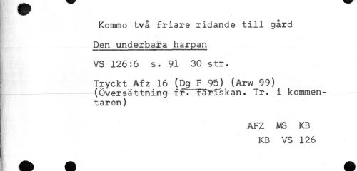 //// Kommo två friare ridande till gård //// Den underbara harpan //// } //// VS 126:6 s. 91 30 str. //// Tryckt Afz 16 (Dg F 95) (Arw 99) //// (Översättning fr. iaHskan. Tr. i kommen- //// taren) //// AFZ MS KB //// KB VS 126 ////