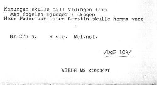 //// Konungen skulle till Vidingen fara //// Men fogelen sjunger i skogen ^ //// Herr Peder och liten Kerstin skulle hemma vara //// * //// Nr 278 a. 8 str. Mel.not. //// /DgF 109/ //// WIEDE MS KONCEPT //// \ ////