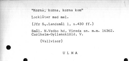 //// . - ^ .....^ //// "Kornan koma, koma kom" //// Locklåtar med mel. //// (Jfr Sy.Landsmål 1, s.430 ff.) //// Smål. N.Vedbo hd? Vireda sn. m.m. 16362. //// Carlheim-Gyllenskiöld, V. //// (Vallvisor) ////