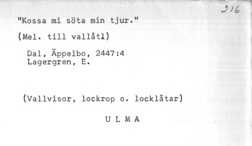 //// "Kossa mi söta min tjur." //// (Mel. till vallåtl) //// Dal, Äppelbo, 2447:4 //// Lagergren, E. //// < //// (Vallvisor, lockrop o. locklåtar) //// ULMA ////