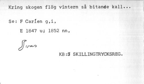 //// Kring skogen flög vintern så bitande kall... //// Se: F Carlen g,i, //// E 1847 u; 1852 nn, //// ff ' //// KB:S SKILLINGTRYCKSREG. ! //// i ////