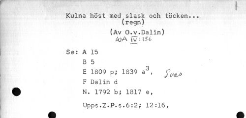 //// * //// Kulna höst med slask och töcken... //// (regn) //// * //// (Av O.v.Dalin) //// Se: Å 15 //// B 5 //// E 1809 p; 1839 a^, //// F Dalin d //// ^ N. 1792 b; 1817 e, //// Upps.Z.P.s.6:2; 12:16, //// å å å ////