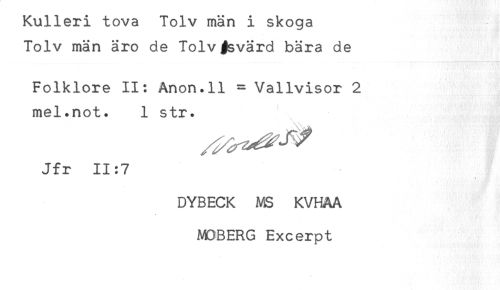 //// Kulleri tova Tolv män i skoga //// Tolv män äro de Tolvj^svärd bära de //// Folklore II: Anon.ll = Vallvisor 2 //// mel.not. 1 str. //// Jfr 11:7 //// DYBECK MS KVHAA //// MOBERG Excerpt ////