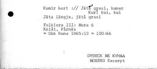 //// Kumir bort :// Jäta grasi, kuner //// ^ Kurt kui, kui //// Jäta längje, jätå grasi //// Folklore III: Mora 6 //// Kolåt, Fårnäs //// = Dbk Runa 1865:12 = 100:66 //// } //// DYBECK MS KVHAA //// MOBERG Excerpt ////