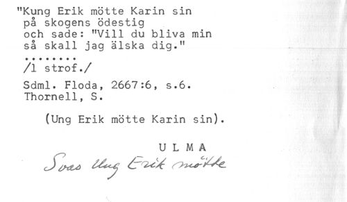 //// på skogens ödestig //// och sade: "Vill du bliva min //// så skall jag älska dig." //// /I strof./ //// Sdml. Flöda, 2667:6, s.6. //// Thornell, S. //// (Ung Erik mötte Karin sin). //// U L M A //// r ////