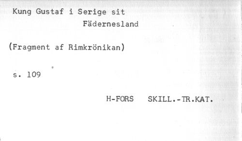 //// Kung Gustaf i Serige sit //// Fädernesland //// t //// (Fragment af Rimkrönikan) //// t //// : //// f //// ' '. '. f //// i //// t //// * //// s. 109 //// H-FORS SKILL.-TR.KAT. //// t //// i //// ! ////
