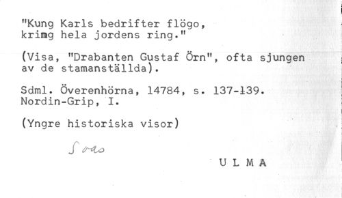 //// "Kung Karls bedrifter flögo, } //// krimg hela jordens ring." //// * //// (Visa, "Drabanten Gustaf Örn", ofta sjungen //// av de stamanställda). ) //// Sdml. Överenhörna, 14784, s. 137-139. ! //// Nordin-Grip, 1. ! //// (Yngre historiska visor) //// U L M A ////