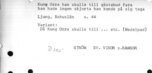 //// nung urre nan skulle till gastabud tara //// han hade ingen skjorta han kunde på sig taga //// Ljung, Bohuslän s. 44 //// Variant: //// Då Kung Orre skulle till ... etc. (Medelpad) //// ^ STRÖM SV. VISOR o.RAMSOR ////