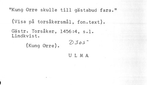 //// "Kung Orre skulle till gästabud fara." //// (Visa på torsåkersmål, fon.text). //// Gästr. Torsåker, 1456:4, s.l. //// Lindkvist. //// (Kung Orre). //// U L M A //// t ////