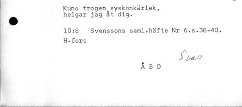 //// Kuno trogen syskonkarlek, //// helgar jag åt dig. //// 10:8 Svenssons sarnl.häfte Nr 6.s.38-40. //// H-fors //// . //// ÅBO //// * ////
