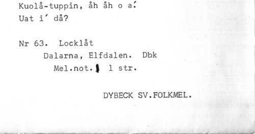 //// * v v ^ r^ ^ ---- --- ^ ^- //// Uat i' då? //// Nr 63. Locklåt //// Dalarna, Elfdalen. Dbk //// Mel.not.) 1 str. //// i //// { //// DYBECK SV.FOLKMEL. //// '< 't 't 'J*'.' - a ////