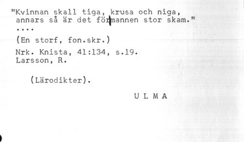 //// . //// "Kvinnan skall tiga, krusa och niga, //// annars så är det föijmannen stor skam." //// * $ * + //// (En storf, fon.skr.) //// Nrk. Knista, 41:134, s.19. //// Larsson, R. //// (Lärodikter). //// U L M A ////