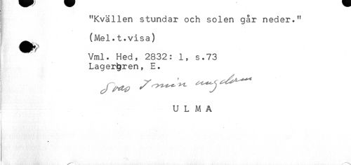 //// I "Kvällen stundar och solen går neder." //// ! //// (Mel.t.visa) //// Vml. Hed, 2832: 1, s.73 //// Lagergren, E. //// U L M A //// * ////