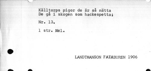 //// '.t ''.'.. .. - - .. //// Källtorps pigor de är så nätta //// De gå i skogen som hackespetta; //// . //// Nr. 13. //// 1 str. Mel. //// LANDTMANSON FATABUREN 1906 ////