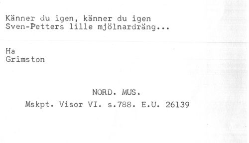 //// Känner du igen, känner du igen //// Sven-Petters lille mjölnardräng... //// Ha //// Grimston //// NORD. ms. //// Mskpt. Visor VI. s.788. E.U. 26139 ////