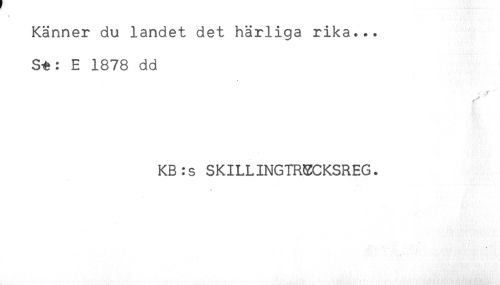 //// Känner du landet det härliga rika... //// S-e: E 1878 dd //// KB:s SKILLINGTRECKSREG. //// < ////