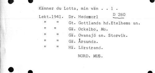 //// Känner du Lotta, min vän . . 1 . //// Lekt.1941. Dr. Hedemorl il^SP //// " " Gt. Gottlands hd.Etelhems sn. //// " " Gä. Ockelbo, Mo. //// ! " Gä. Ovansjö sn. Storvik. //// I " " Gä. Årsunda. //// ' " " Hä. Lörstrand. //// ! ? //// t d< * //// j NORD. MUS. ////