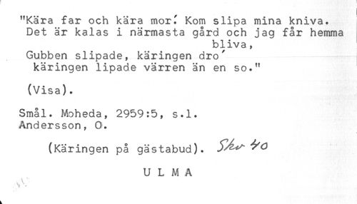 //// "Kära far och kära morf Kom slipa mina kniva. //// Det är kalas i närmasta gård och jag får hemma //// bliva, //// Gubben slipade, käringen dro' //// käringen lipade värren än en so." //// (Visa). //// Smal. Moheda, 2959:5, s.l. //// Andersson, O. //// < //// (Käringen på gästabud). //// U L M A //// k ////