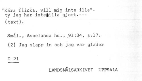 //// "Kära flicka, vill mig inte illa", //// ty jag har inte$.illa gjort.--- //// (text). //// Smål., Åspelanda hd., 91:34, s.17. //// (2( Jag slapp in och jag var gläder //// D 21 //// LANDSMALSARKIVET UPPSALA ////