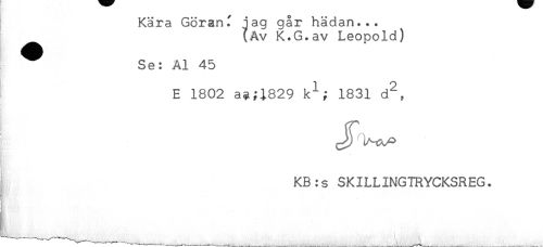 //// Kära Göranf lag går hädan... //// {Av K.G.av Leopold) //// Se: Al 45 //// E 1802 a?;i829 k^; 1831 d^, //// * //// * //// - //// t //// - //// KB:s SKILLINGTRYCKSREG. //// - //// . //// - //// & //// A ////