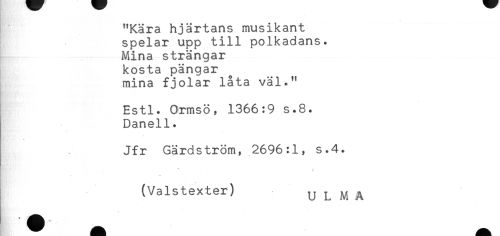 //// "Kära hjärtans musikant //// spelar upp till polkadans. //// Mina strängar //// kosta pängar //// mina fjolår låta väl." //// Estl. Ormsö, 1366:9 s.8. //// Daneli. //// Jfr Gärdström, 2696:1, s.4. //// t* //// (Valstexter) U L M A ////