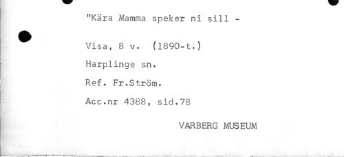 //// } "Kära Mamma speker ni sill - //// Visa, 8 v. (1890-t.) //// i Harplinge sn. //// Ref. Fr.Ström. //// Acc.nr 4388, sid.78 //// . //// VARBERG MUSEUM //// - //// - ////