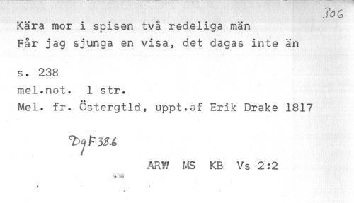 //// J3G //// Kära mor i spisen två redeliga män //// Får jag sjunga en visa, det dagas inte än //// s. 238 //// mel.not. 1 str. //// Mel. fr. Cstergtld, uppt.af Erik Drake 1817 //// ARW MS KB Vs 2:2 //// ** ////
