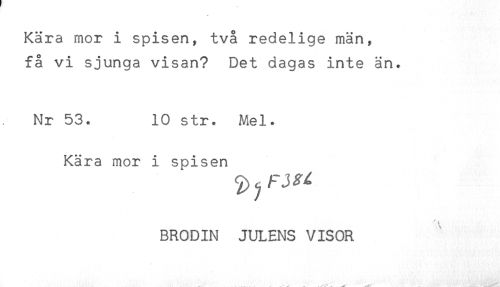 //// Kära mor i spisen, två redelige män, //// få vi sjunga visan? Det dagas inte än. //// Nr 53. 10 str. Mel. //// Kära mor i spisen //// BRODIN JULENS VISOR ////