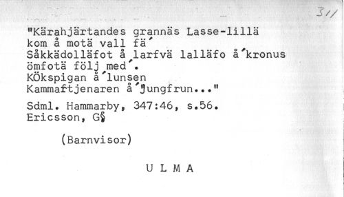 //// - * ., . . - ^ -- -. *- -* //// "Kärahjärtandes grannäs Lasse-lillä //// kom å motä vall fä" //// Såkkädolläfot å larfvä lalläfo å^kronus //// ömfotä följ med". //// Kökspigan å"lunsen //// Kammaftjenaren å"jungfrun..." //// Sdml. Hammarby, 347:46, s.56. ! //// Ericsson, G§ //// < //// i //// (Barnvisor) //// U L M A ////