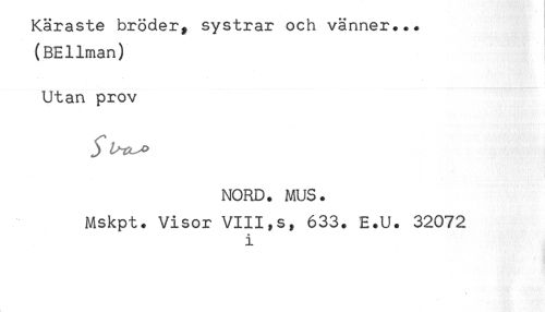 //// Käraste bröder, systrar och vänner... //// (BEllman) //// Utan prov //// NORD. MUS. //// Mskpt. Visor VIII,s, 633. E.U. 32072 //// v //// 1 ////