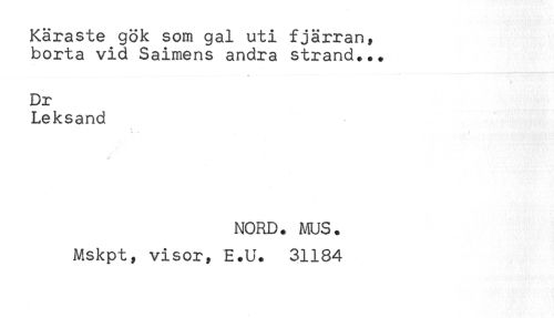 //// Käraste gök som gal uti fjärran, //// borta vid Saimens andra strand... //// v //// Dr //// Leksand //// NORD. MUS. //// Mskpt, visor, E.U. 31184 ////