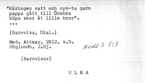 //// "Käringen satt och nys-ta garn //// pappa gått till Örebro //// köpa skor åt lille bror". //// * * + //// (Barnvisa, Dial.) //// Med. Attmar, 2812, s.5. ^ /„ t //// Höglundh, J.Hj. ^ //// (Barnvisor) //// U L M A ////