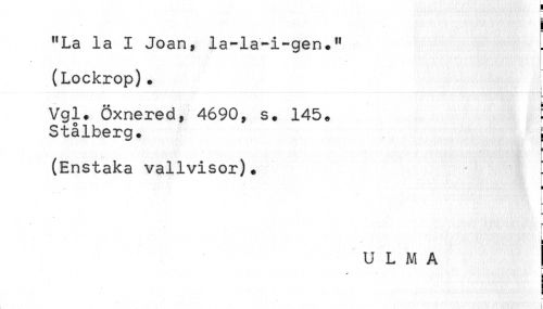 //// "La la I Joan, la-la-i-gen." //// (Lockrop). ! //// Vgl. Öxnered, 4690, s. 145. S //// Stålberg. } //// < //// (Enstaka vallvisor). //// } //// U L M A //// i //// [ //// < //// ) //// i //// t ////