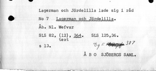 //// Lagerman och Jördelilla lade sig i råd //// ^^ No 7 Lagerman och Jördelilla. //// Åb. NI. Wefvar //// SLS 82, (12), 364. SLS 125,36. //// text //// ÅBO SJÖBERGS SAML. //// ___ ^ ^ ^ _____ _-- -___ ^ - ////