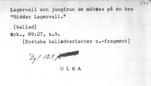 //// Lagervall och jungfrun de möt&es på en bro //// "Riddar Lagervall." //// (ballad) //// Mrk., 89:27, s.9. //// (Enstaka balladvarianter o.-fragment) //// U L M A ////