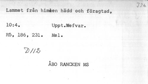 //// Lammet från himåen hädd och föragtad, //// 10:4. Uppt.Wefvar. //// R5, 186, 231. Mel. //// * //// ÅBO RANCKEN MS ////