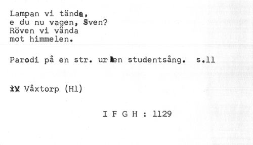//// Lampan vi tända, //// e du nu vägen, Sven? //// Röven vi vända //// mot himmelen. //// Parodi på en str. ur^n studentsång, s.ll //// iM Våxtorp (Hl) //// I F G H : 1129 ////