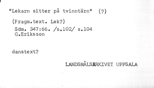 //// "Lekarn sitter på tvinntärn" (?) //// (Fragm.text. Lek?) //// Sdm. 347:66. /s.102/ s.104 //// G.Eriksson //// danstext? //// LANDSMÅLSARKIVEI UPPSALA //// ^ * ////