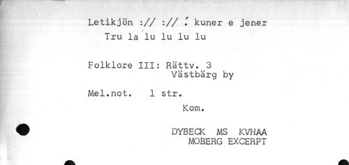 //// t //// Letikjön :// :// ^ kuner e jener //// Tru la lu lu lu lu //// t //// Folklore III: Rättv. 3 //// Västbärg by //// Mel.not. 1 str. //// Kom. //// ^ DYBECK MS KVHAA //// MOBERG EXCERPI ////