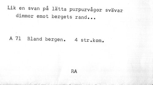 //// Lik en svan på lätta purpurvågor svävar //// dimmor emot bergets rand... //// A 71 Bland bergen. 4 str.kom. //// RA ////