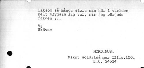 //// Liksom så många stora män här i världen //// helt blygsam jag var, när jag började //// färden ... //// - //// Vg //// Skövde //// ' . ' //// ^ NORD.MUS. //// Mskpt soldatsånger III.s.150. //// E.U. 24524 ////