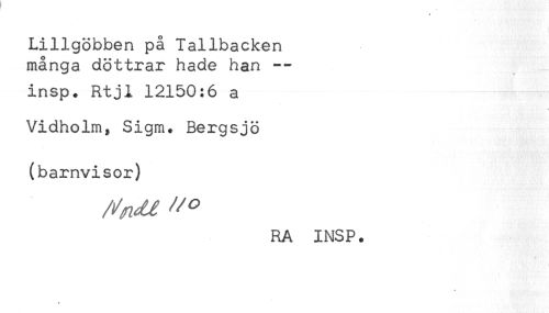 //// Lillgöbben på Tallbacken //// många döttrar hade han -- //// insp. Rtjl 12150:6 a //// Vidholm, Sigm. Bergsjö //// (barnvisor) //// RA INSP. ////