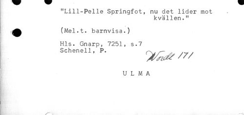 //// "Lill-Pelle Springfot, nu det lider mot //// kvällen." //// ^^ (Mel.t. barnvisa.) //// Hls. Gnarp, 7251, s.7 //// sch^ii, P. //// U L M A ////