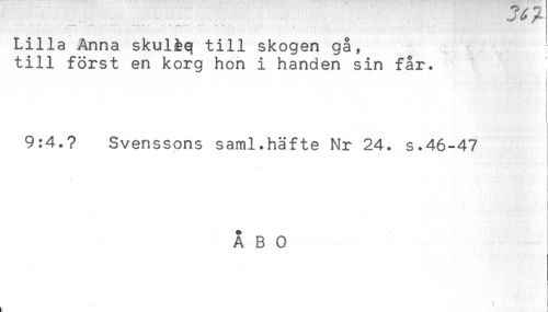 //// Lilla Anna skul&q till skogen gå, //// till först en korg hon i handen sin får. //// i //// < //// i //// t //// 9:4.? Svenssons saml.häfte Nr 24. s.46-47 //// ÅBO ////