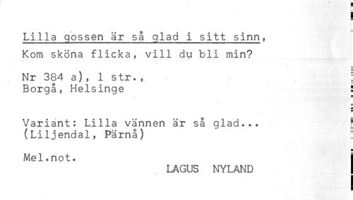 //// Lilla gossen är så glad i sitt sinn, //// Kom sköna flicka, vill du bli min? //// Nr 384 a), 1 str., ; //// Borgå, Helsinge ^ //// Variant: Lilla vännen är så glad... } //// (Liljendal, Pärnå) = //// Mel.not. ) //// LÅGUS NYLAND ] //// i ////