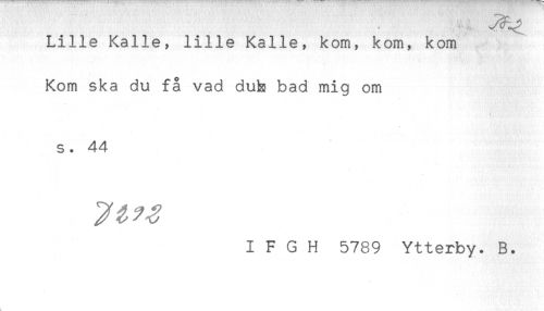 //// Lille Kalle, lille Kalle, kom, kom, kom //// Kom ska du få vad duk bad mig om //// s. 44 //// I F G H 5789 Ytterby. B. ////