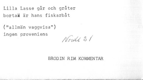 //// Lilla Lasse går och gråter //// bortaä är hans fiskarbåt //// ("allmän vaggvisa") //// ingen proveniens //// % //// /BRODIN RIM KOMMENTAR ////